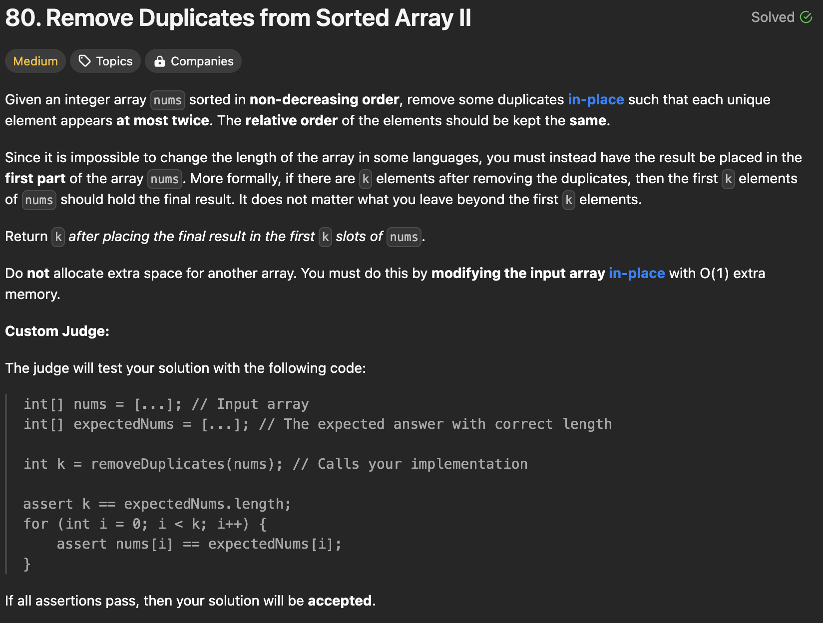 26번 문제(Remove Duplicates from Sorted Array)와 굉장히 유사합니다. 다만 dup_count로 같은 문자가 두 번 나왔음을 추가로 체크해주면 됩니다.
