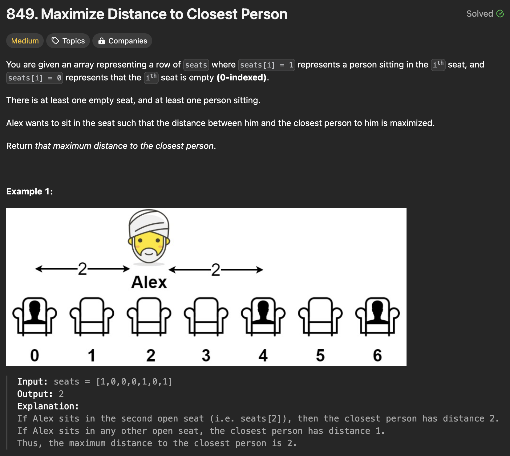 문제 링크: https://leetcode.com/problems/maximize-distance-to-closest-person/description/